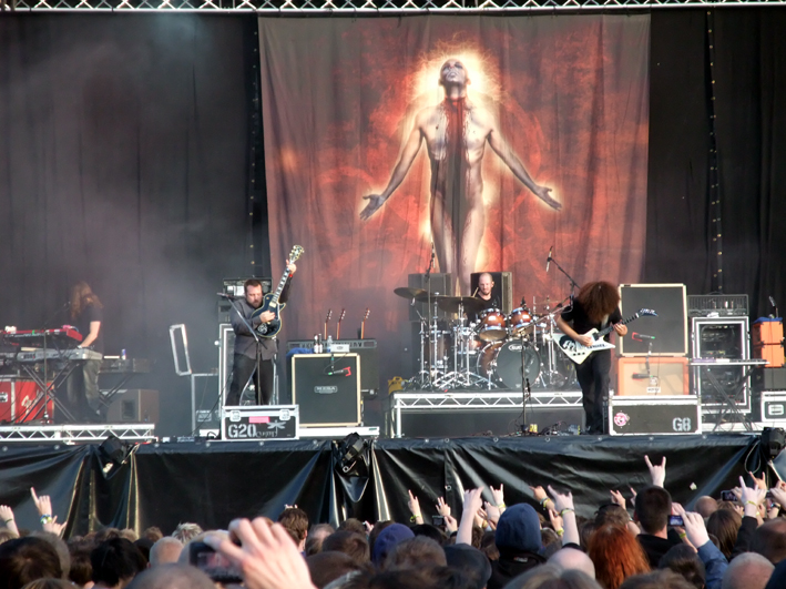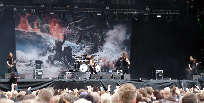 dag! Den första kvällens höjdpunkt var tyska Rammstein som är ett monster på scen med scenuppbyggnad som en flygplanshangar och pyroteknik. Stenhård hårdrock i varietéform med klädombyten, brinnande personer, explosioner och inte minst genomtänkt musik. Helt otroligt egentligen, tysk industrimetall när den är som bäst och Rammstein sjunger nästan enbart på tyska, publiken skanderar: "Du hast, Du hast mich, Du hast"! Den pålade lermarken i frihamnen gungar under publikens rörelser! Svenska Amon Amarth har en trogen