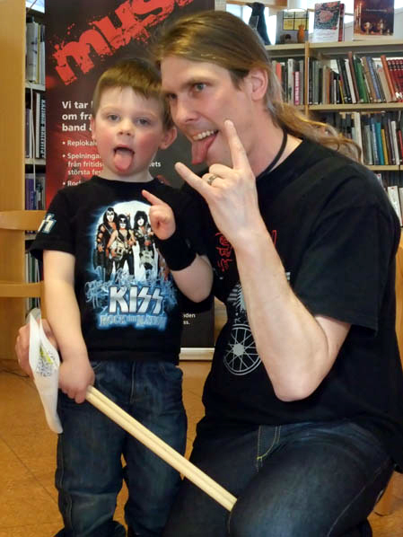 Edsbygitarristen Per Baggström med sin 3-åriga son Willy (se bild), visade hur man klär sig och poserar ā la hårdrock! På plats fanns en rockig tipsrunda där förstapriserna var signerade exemplar av "Jacks rockiga resa" av författarinnan Therés Stephansdotter Björk. Barnen