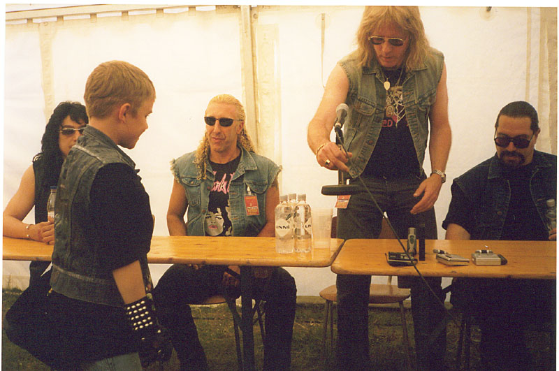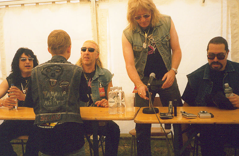 Blind Guardian från Tyskland drog mycket publik, själv har jag inget speciellt förhållande till gruppen men de spelade som sig bör tysk metall. Istället valde jag Wishbone Ash på Sweden Stage med frontmannen Andy Powell. Wishbone Ash första klassiska skiva kom 1970. Smäktande, melodiösa och ibland tunga riff speglar deras musik. The King Will Come och Phoenix gjorde att många minnen väcktes till liv. Uriah Heep hade enormt drag redan från början med Easy Livin´. De spelade alla klassiker och tillfredställde fansen. Sedan må unga journalister från Aftonbladet skriva vad de vill, vadå " hopplöst förlegat". Anthrax överraskade på mig med sina tunga melodiösa låtbyten med bra tempo och inlevelse. Klart sevärt! Twisted Sister har återförenats efter 17 år och gjorde vad de kunde för att rocka loss som sista headliner på söndag natt. Regnet och trasslande mickar förstörde dock lite av konserten. Dee Snider var faktiskt bättre med sitt eget band för två år sedan på Sweden Rock Festival men det är klart, alla nostalgiker trivdes med I Wanna Rock och We´re Not Gonna Take It.