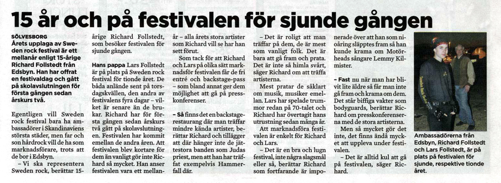 Judas Priest krossade allt i sin väg, Blue Öyster Cult körde alla sina bästa 70-talslåtar och Triumph triumferade med sin första konsert på 20 år! Mycket var sig likt på den sjuttonde festivalen och självklart var det nytt rekord med 33 200 hårdrockare i publiken. En otrolig bedrift! Jag hade eget jubileum med tio raka festivaler och Richard med sina 15 år har sju festivaler. För oss började det på torsdag kväll med att träffa journalisten Ylva Lundin som skulle skriva om Hälsingar på Sweden Rock i Hälsingetidningarna. Richard skulle intervjuas med sina unga år och sju festivaler, säkert ett svårslaget rekord för en ungdom!