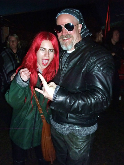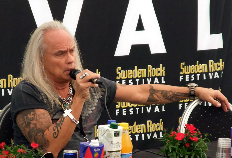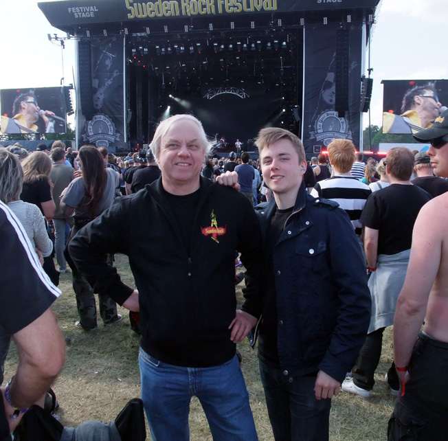 Schenker Group. Motörhead regerar med sin energi, deras "Bomber" flygplan på scenen som lyser och vickar på vingarna till Ace of Spades och inte minst har Motörhead spelat konstant sedan 1970-talet utan avbrott och gör nya album hela tiden. Minst sagt imponerande! Mikkey Dees frenetiska trumsolo får luften att vibrera och det finns bara en Lemmy! 9 stjärnor av 10 till Motörhead! Extra kul var det att träffa fler edsbybor, Krister Nilsson med dotter Marta som verkligen trivdes på festivalen. Twisted Sister med energiske frontmannen Dee Snider avslutade fredagskvällen med sina klassiska hits från albumet Stay Hungry. Richard och jag är ambassadörer med VIP-pass och vi fick denna gång en guidad tur bakom de stora scenerna Festival Stage och Rock Stage av marknadschefen Mark Frostenäs. Det krävs bra logistik och det är ständigt två bands utrustning redo bakom scenerna för att hinna sättas upp inklusive soundcheck. Det var riktigt kul att få stå bakom scenen när 80-talsrockarna Girlschool lirade. Vi träffade Sabatons sångare och frontman Joakim Brodén backstage vid Sweden Rocks samarbetspartnertält (se bild). Riktigt cool kille! |