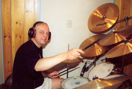 Man fick sitta instängd i en liten trumstudio med hörlurar. Jag fick plats med alla cymbaler utom en. Det är kanon att spela på det här sättet faktiskt.