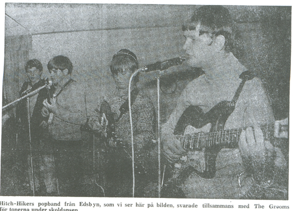 Hitchhikers, från vänster Alf Persson kompgitarr och sång, Lennart Norell bas och Sven-Olov "Trintan" Lind sologitarr och sång. Som vanligt än idag när det tas bilder på grupper så syns inte trummisen, här var det Thomas Käll bakom trummorna. Allra längst till vänster skymtar Per-Olov Olanders. Se who´s who för mer info om Hitchhikers!